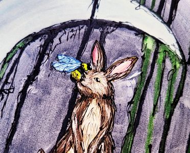 0 savesA fine artist print of an original acrylic painting of an adorable brown bunny sitting atop a crescent moon with a bumble bee resting on its note.