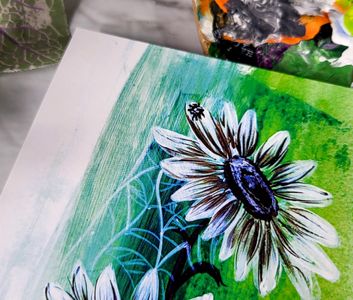 Both the background and daisies were painted from left over paint from another painting to make a mystic and eye catching balance of color and black and white.