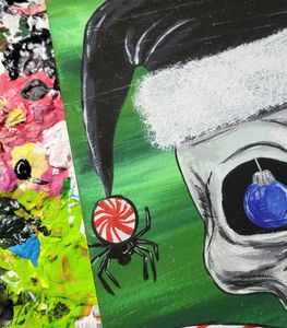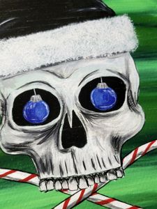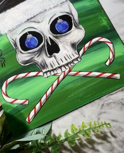 This would be a great addition to any home that has a spooky vibe that still tries to be festive. With a black Santa hat that has a peppermint spider hanging from it and the bright blue ornaments as eyes, he belongs somewhere that will love him! Of course I had to add the festive of candy canes instead of cross bones.