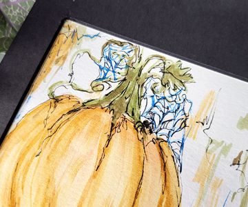 0 savesAn original painting of an orange pumpkin with a tiny black spider that has made a home atop it with a pretty blue web.