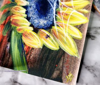 Both the background, flower and spider were painted from left over paint from another painting to make a sweet sunflower on top of a warm colored background
