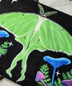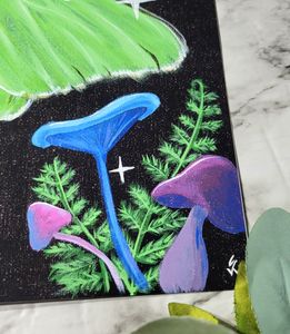 Luna moth fluttering between galaxy colored mushrooms and green ferns.