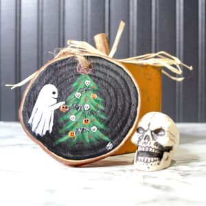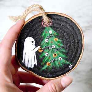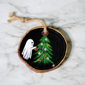 This is a hand painted wooden ornament featuring a cute little ghosty happily decorating his Christmas tree with spooky decorations.