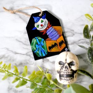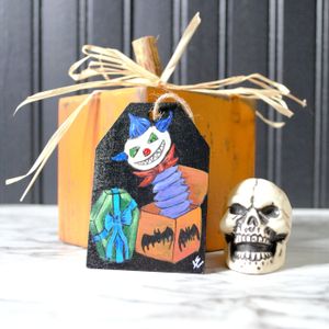 A wooden tag shaped ornament with a spooky Jack in the box and a coffin shaped present.
