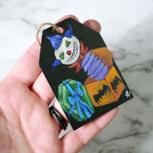 This is a hand painted wooden ornament featuring a Jack in the box of nightmares and a coffin shaped gift.