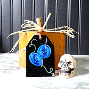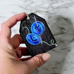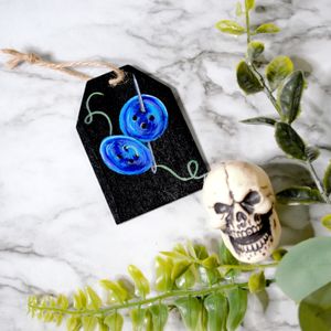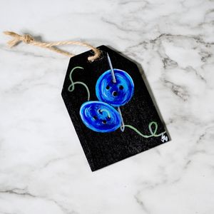 This is a hand painted wooden ornament featuring 2 blue buttons with a needle and thread. One of one ornament perfect for anyone that like sewing or Coraline!
